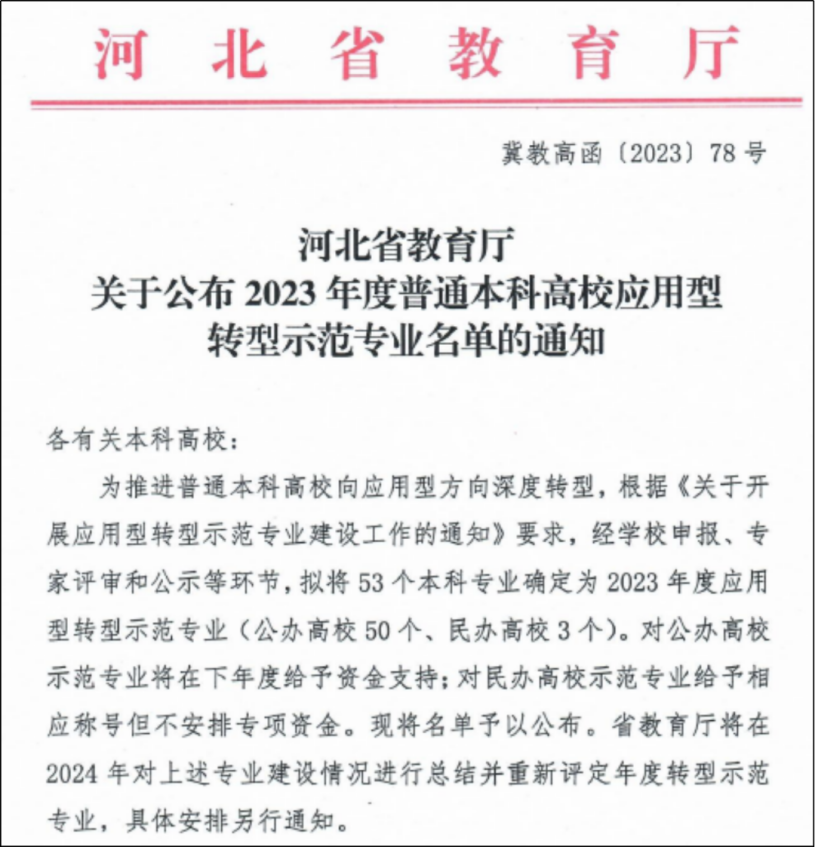 近日,河北省教育厅发布了《河北省教育厅关于公布2023年度普通本科高校应用型转型示范专业名单的通知》,经学校申报、专家评审和公示等环节,拟将53个本科专业确定为2023年度应用型转型示范专业,其中av影片