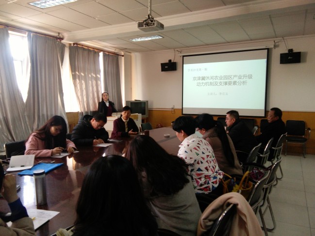 2017年2月27日下午3:30,av影片 学术沙龙活动在二楼会议室召开,李庄玉博士分享了自己的博士论文《京津冀休闲农业园区产业升级动力机制及支撑要素分析》,祁红梅副院长主持、刘凤长书记及科研骨干参加了活动。