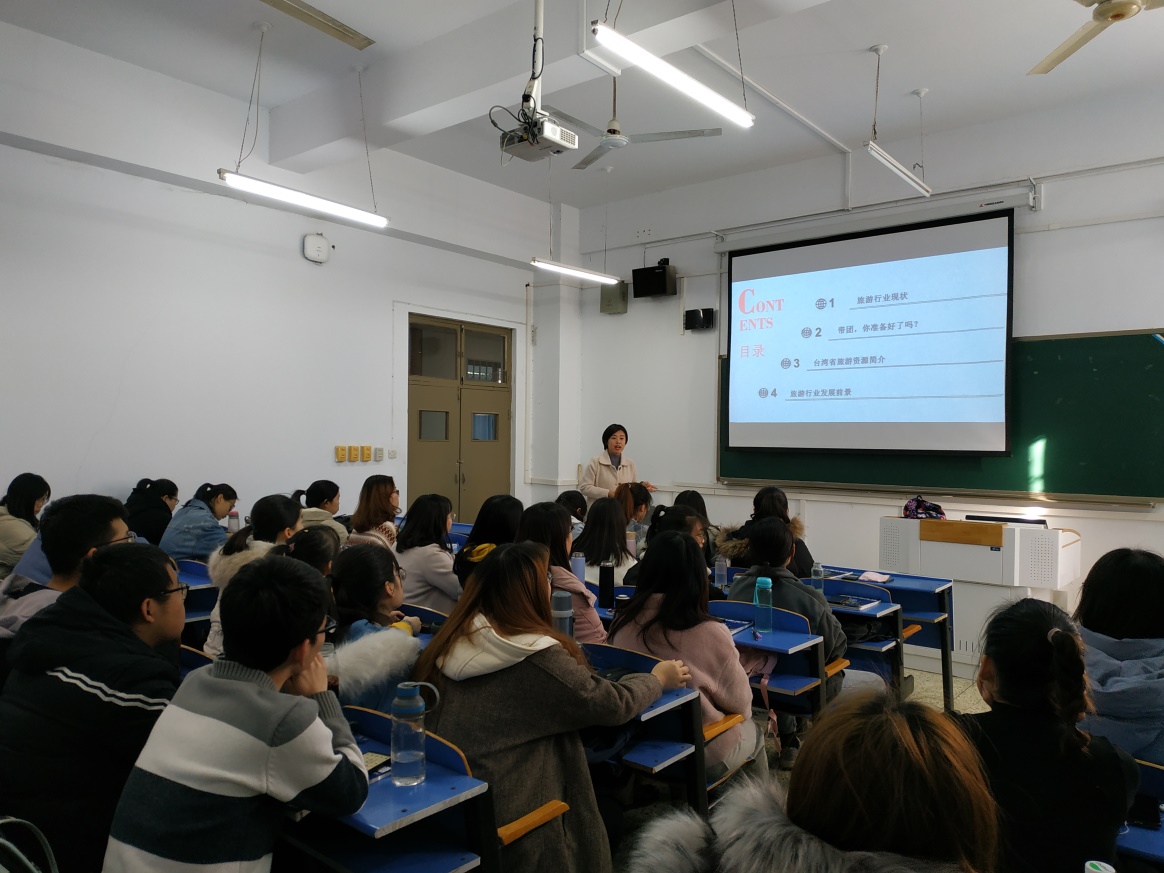 课堂上,郭杰老师结合了自己的工作经历就旅游行业现状,带团要求,台湾旅游资源,旅游行业发展前景等与同学们进行了分享。精彩幽默的讲授使同学们感受到了一个优秀旅游工作者的风采,获得了同学们热烈的掌声。与此同时,使同学们更加深入地了解到旅游行业的从业要求,更加坚定了努力学习的信念。