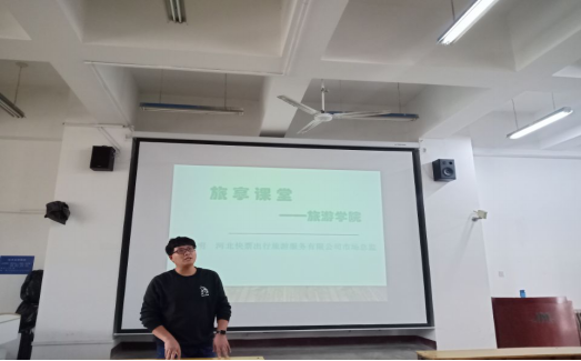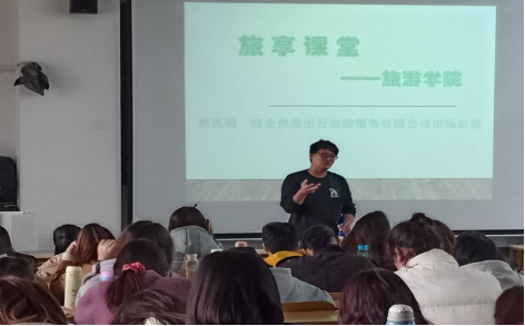 为了让同学们更好的了解旅游业、更好的了解旅游的相关知识,2020年10月30日我们邀请了河北快票出行旅游服务有限公司市场总监胡高明,在北五教第二教室张灿老师的《休闲旅游与消费》课上与G18级旅游管理专业、G18级酒店管理专业、G18级市场营销专业、G18级会计专业的学生进行了交流与分析,加深了同学们对旅游业的认识。