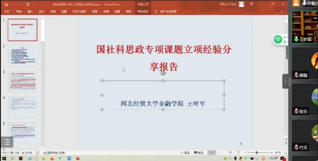 近日,av影片 举办了国家社科基金项目交流会,会议邀请金融学院王叶军博士进行了题为“国社科思政专项课题立项经验分享报告”的分享,从课题的申报准备、多维度分解、创新性分析等方面提出了指导建议,讲座内容对师生科研项目的申报有一定的指导作用。