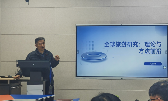 副院长吴士锋副教授作题为“全球旅游研究:理论与方法前沿”的专题讲座,学院全体教师参加了本次活动。