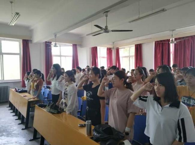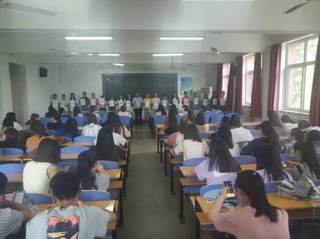 于206教室举办“诚信励志节约”宣誓仪式。此次宣誓仪式学院资助工作负责人李同法主持,学院全体国家助学贷款100余名学生参加大会。