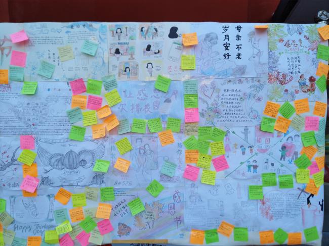 此次感恩节主题教育系列活动分为“装饰校园”、“向灯塔致敬”、“致青春,致我们一起走过的战友”和“让感恩之风吹拂身边之人”四个模块。活动期间,用气球和丝带装扮的学院办公室营造了浓浓的感恩节气氛,同学们在感恩墙上用便利贴和手抄报的方式书写祝福语,表达对恩师和父母的由衷感谢。在“向灯塔致敬”和“致青春”环节,同学们用心DIY礼物送给老师和朋友,在寒冷的冬季送去感恩的温暖。同时,学院微信、微博等新媒体平台推出感恩节系列专题,开展网上感恩节祝福活动,扩大了主题教育活动的影响力。