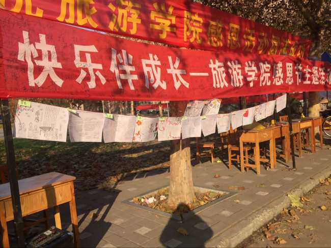 许多路过的同学们为自己喜欢的作品进行了投票,并签名留念。工作人员为所有投票的同学们系上了黄丝带,让同学们在寒冷的冬天感受到了暖意,将感恩之心共同传递下去。最终酒店管理高本1班的许洪伟同学获得了本次比赛的一等奖,他的作品不仅图案美观,给人以赏心悦目的感觉,而且内容生动,感恩主题突出。