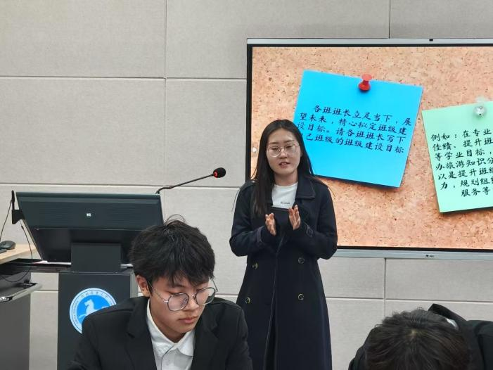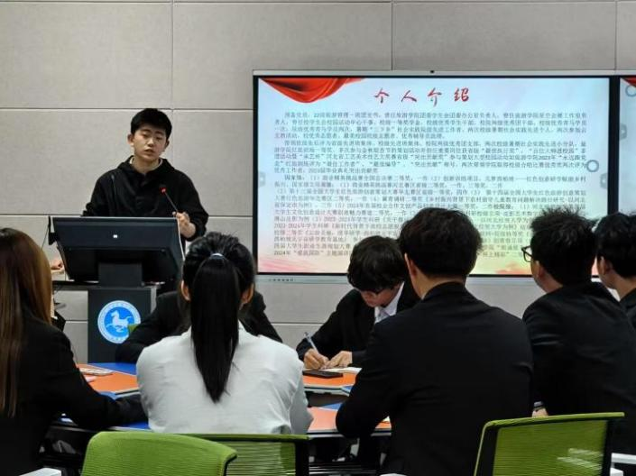首先,在经验分享环节,由省级优秀班集体2022级旅游管理1班团支书安柄弛学长发言。他从班级建设、学风建设、志愿活动和所得荣誉等方面入手,结合自己班级的实际情况,分享了自己在班级管理中的心得体会。他提出作为干部,要带领同学们凝心聚力,坚定红色信仰,充分发挥班级成员的主观能动性和积极性,学业技能双开花,科创学术齐争鸣,共同打造一个团结、和谐、奋进的班集体。