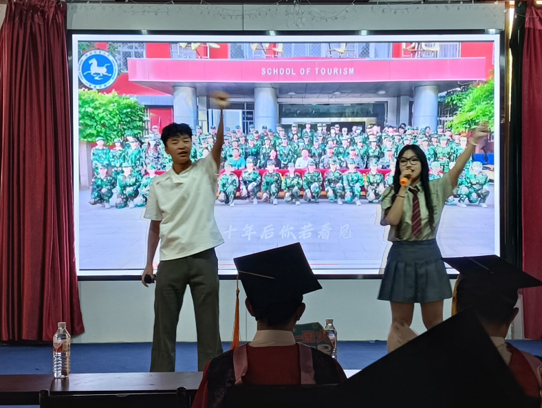 典礼第四项,为表达对毕业生的祝福与惜别之情,典礼特别安排了精彩的文艺表演。歌曲《像你这样的朋友》、《北京东路的日子》及诗朗诵《闪耀吧,青春的火光》,由在校学子、毕业生代表以及“旅享”红色文化宣讲团成员们倾情演绎,重温校园点滴,传递深厚情谊与对未来的美好憧憬。