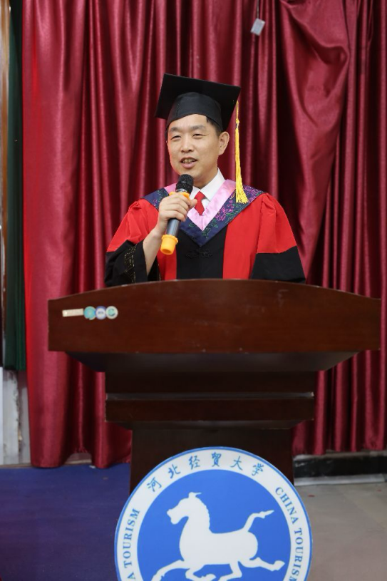 全体2025届毕业生表示最热烈的祝贺,勉励广大经贸学子持续奋斗,不断成长,努力成为与时俱进的时代青年。随后,旅游学院院长孙振杰教授致辞,孙院长深情寄语毕业生,并对未来征程提出殷切期望。伴随着热烈的掌声,优秀教师代表吴英博士、学生代表吉曲莹、优秀毕业生代表白家乐以及优秀校友闫晓霞分别发言致辞。