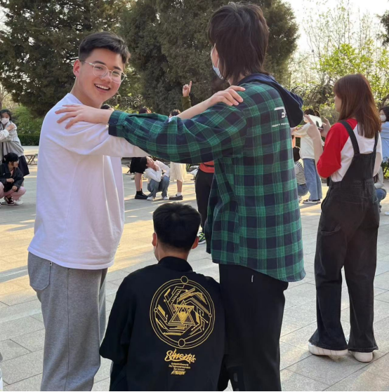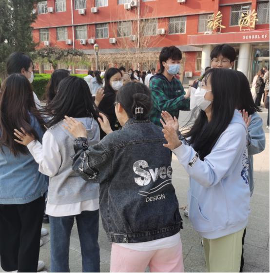 第四个游戏——我们是一家人。同学们结成十个小组,互相拍后背和拍手,并说出对应的语句,用时最短的小组获胜。这个游戏让大家能够互相了解,锻炼了彼此的协作能力。