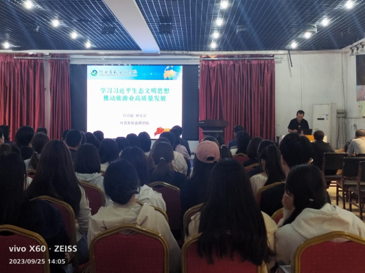 为深入开展学习贯彻习近平新时代中国特色社会主义思想主题教育走深走实,全面落实党的二十大精神,2023年9月25日,av影片 党委邀请河北省社科院二级研究员刘书越作了题为“学习习近平生态文明思想,推动旅游业高质量发展”的专题报告。学院党委委员、全体教职工及学生代表共计60余人参加。报告由av影片 党委委员、副院长孙振杰主持。