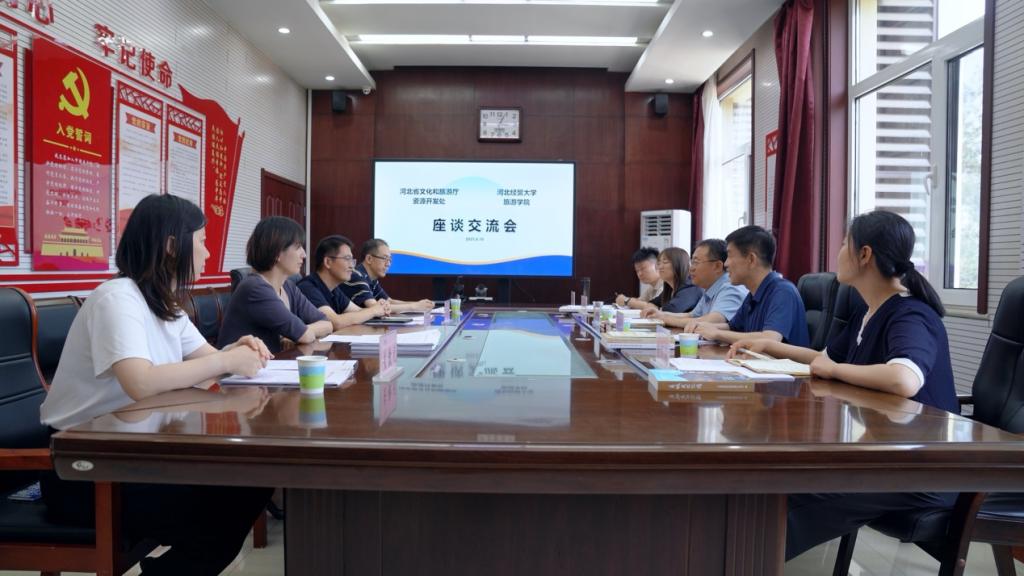 党委书记董爱民,院长孙振杰、副院长侯聪,长城文化经济带绿色发展研究中心副主任庞笑笑、党支部书记张伸阳到河北省文化和旅游厅资源开发处进行对接学习交流。河北省文化和旅游厅资源开发处处长赵奇、二级调研员许世鹏,河北省文化和旅游研究院旅游发展研究室副主任王立剑、关钦元参加了座谈。