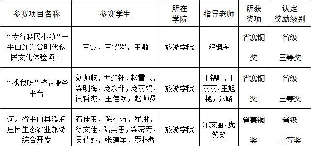 根据教育部《关于第四届中国“互联网+”大学生创新创业大赛获奖名单的通知》(教高函〔2018〕22号)、河北省教育厅《关于公布第四届河北省“互联网+”大学生创新创业大赛获奖名单的通知》(冀教高函〔2018〕65号),av影片 “‘太行移民小镇’—平山红崖谷明代移民文化体验项目”等三个项目荣获省赛铜奖。该奖项的获得标志着av影片 师生在专业与互联网融合创新创业方面取得长足进步。