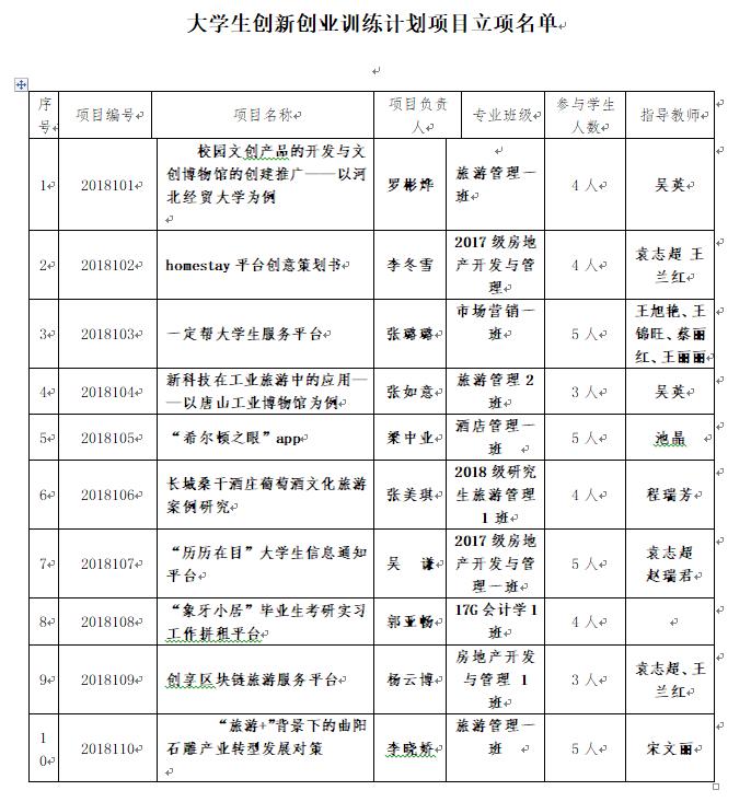 2018---2019学年第一学期大学生创新创业训练计划项目立项名单