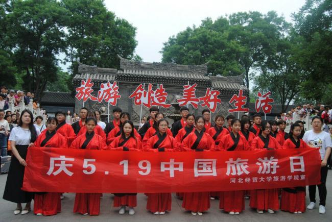 在正定荣国府前开展了以“旅游创造美好生活”为主题的5.19主题快闪活动。旅管专业师生精心准备为市民游客呈现了一场视觉盛宴。