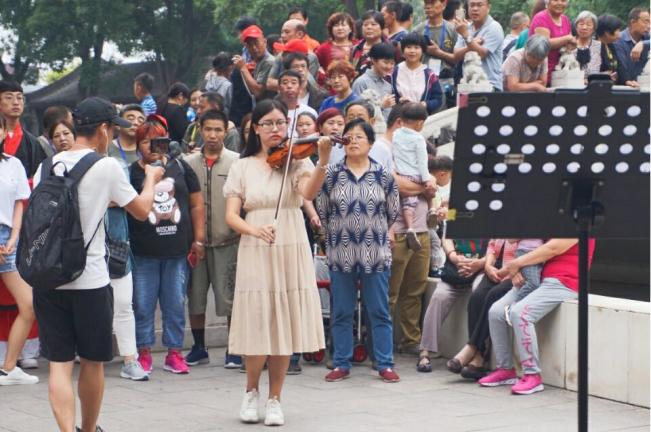 上午9点20分,主题快闪活动正式拉开帷幕。17级旅游管理专业学生才艺秀表演率先登场,他们各展其能,既有优美欢快的小提琴演奏,又有清新唯美口琴展示,更有热辣舞蹈的展示,赢得现场市民游客阵阵掌声。接下来的重头戏是诗赋朗诵,同学们身着汉服,大声吟诵由旅管教研室教师张国鑫创作的《新时代经贸旅游赋》,慷慨激昂的朗诵将快闪活动推向了高潮。
