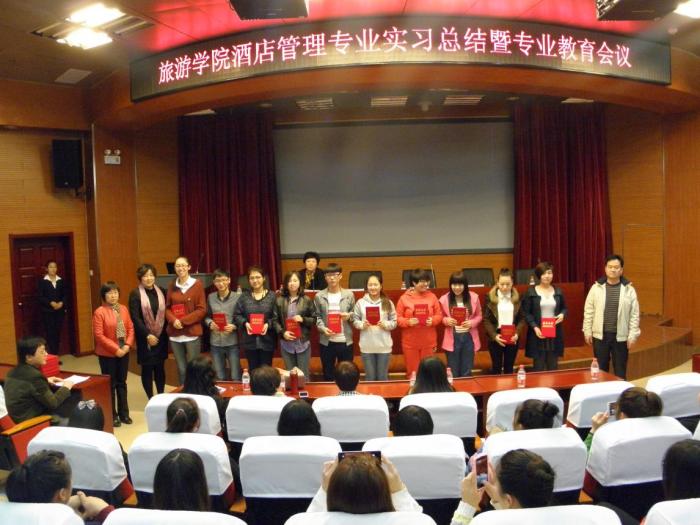 客座教授的仪式,院长程瑞芳为其颁发了聘书。会议第二项内容是实习总结表彰,由酒店管理系主任张宝春对G-酒店12级1班、Z酒店13级1、2班三个班的专业实习进行总结、优秀实习生代表发言,最后学院领导为三个班的优秀实习生颁发了荣誉证书。实习总结会结束后,由新聘任的客座教授权莉为学生做《国际酒店组织结构及人才需求状况》的专业讲座,使同学们更多了解高端酒店对管理人才的培养要求。
