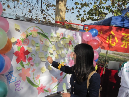 28日上午,志愿者们来到学院教学楼,为学院老师系上黄丝带,同时送上对老师的感恩节祝福,以此来表达对老师辛勤付出的感恩之情,收到祝福和黄丝带的老师都非常开心,感受到了学生的一份沉甸的诚意。