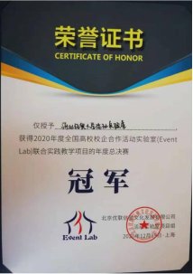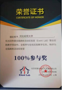 活动实验室(EventLab)全称为全国高校校企合作活动实验室(Event Lab)联合公益实践教学项目,于2020 年 4 月由“EL 活动实验室”和“会 E 人”联合发起。av影片 活动实验室为其发起单位之一。旅游学会展专业多个团队参与了活动实验室2020年度全部任务,其中“追梦队”以年度总决赛初赛第三名的成绩入围总决赛。届会展业未来领袖论坛为定向邀请制,会展专业教师李肖红8名学生应邀参加了本次论坛。20*20微演讲比赛中,朱明月同学以《打破“围墙” “野蛮”生长》为题进行了精彩演讲,最终“追梦队”团队成员:刘旭冉代菲菲、朱明月武瑞萌贾明雨为av影片 活动实验室赢得了 2020年全国高校活动实验室年度总决赛冠军。另外“光之影”队和“E-lite”队分别“2020年度全国高校会展专业项目管理实践能力邀请赛”荣获完美执行奖和“与E计划三期”2019年度总决赛亚军;齐洋畅杨昊曈、郭琬霞同学做为主要成员一起参加了本次论坛。李肖红荣获“全国高校活动实验室2020年度优秀指导教师奖”。av影片 获评“最佳实践教学合作院校”并荣获“团队MVP奖”、“100%参与奖”。