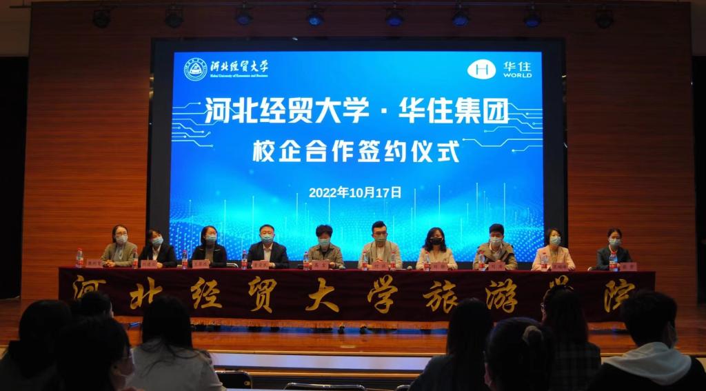 在大学生活动中心三号厅与华住集团签署校企合作协议。学院院长高宏、华住集团河北省省区执行官优秀校友何毅出席签约仪式,学院领导班子成员、企业代表和300余名学生参加。会议由酒店管理系教师计然主持。