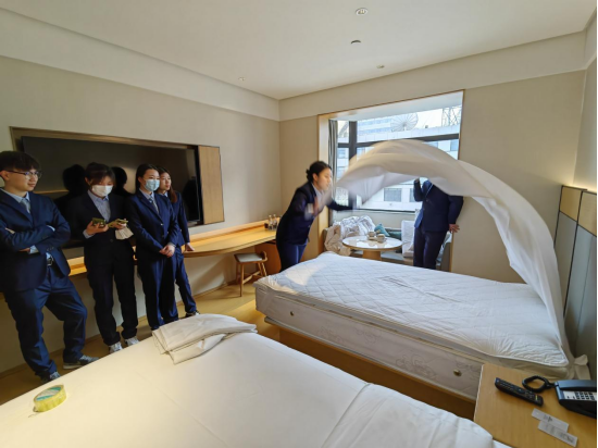 酒店参观活动结束后,全季酒店为同学们安排了实操体验环节。客房清洁训导师们为同学们展示了酒店管理最需要了解的客房铺床基本技能,并指导同学们进行了体验操作。同学们在观摩之后开始了自己的操作,甩床单、包边角、装被芯、装枕套、打枕线,最后收理,虽然做床质量一般,但在体验过程中对于运营管理中所要求的的标准操作流程SOP、督导培训和品控管理等方面都有了切身的体验和深刻的感悟。