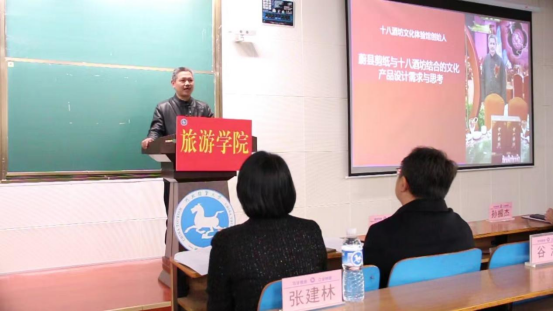 石家庄市十八酒坊文化体验中心创始人、校友李红强先生作“蔚县剪纸与十八酒坊相结合的文创产品设计需求与思考”,结合自身创业发展经历、文创产品文化挖掘、创意设计理念等方面向同学们提出了比较前瞻性的设计建议。
