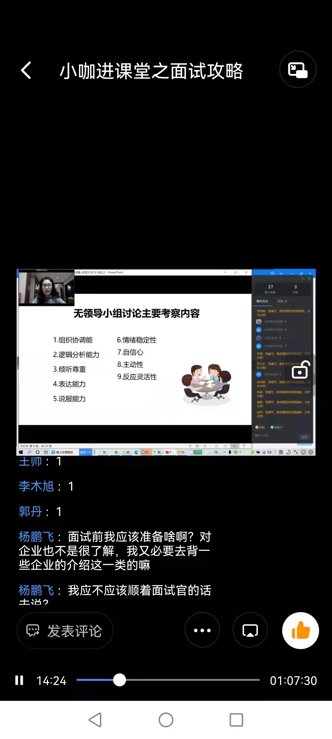 2021年10月12日《度假型酒店经营与管理》课堂,利用晚上的时间,高睿可老师邀请了中华英才网特聘面试官李汶娟女士为G18酒店班的同学上了一堂干货满满的面试技巧实用线上课,同学们问了很多问题,线上课堂气氛热烈。李汶娟女士有20多年的从业经历,每年面试人数破千,实战中积累了丰富的经验,课程内容实用性操作性很强,很受毕业班的同学们欢迎。