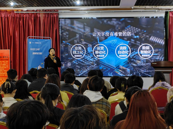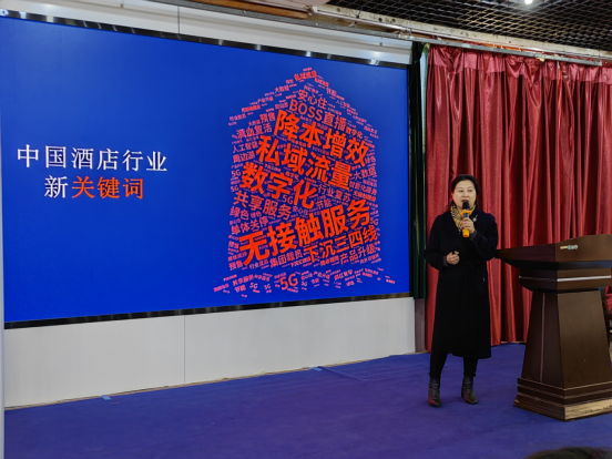 杨雅琴经理以数字化经济时代中国酒店业的新关键词开讲,向同学们普及了“数字化”“私域流量”“无接触服务”“引流裂变”等基于互联网思维的新概念词汇,描述了数字化技术推动酒店行业的转型与变革。