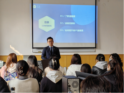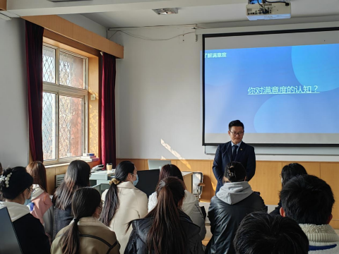 首先,孔经理向同学们抛出一个问题——你对满意度的认知是怎样的?同学们在提问与回答的交互过程中很快进入了课堂状态。之后孔经理从了解满意度、满意度解析和如何提升满意度三个方面由浅及深地讲解有关客户满意度的内容。