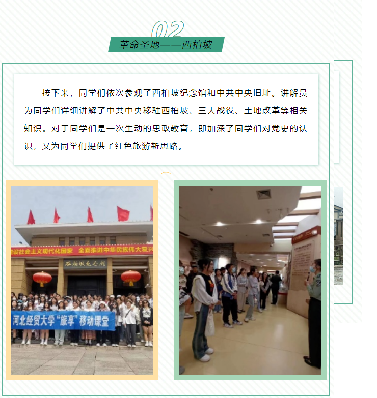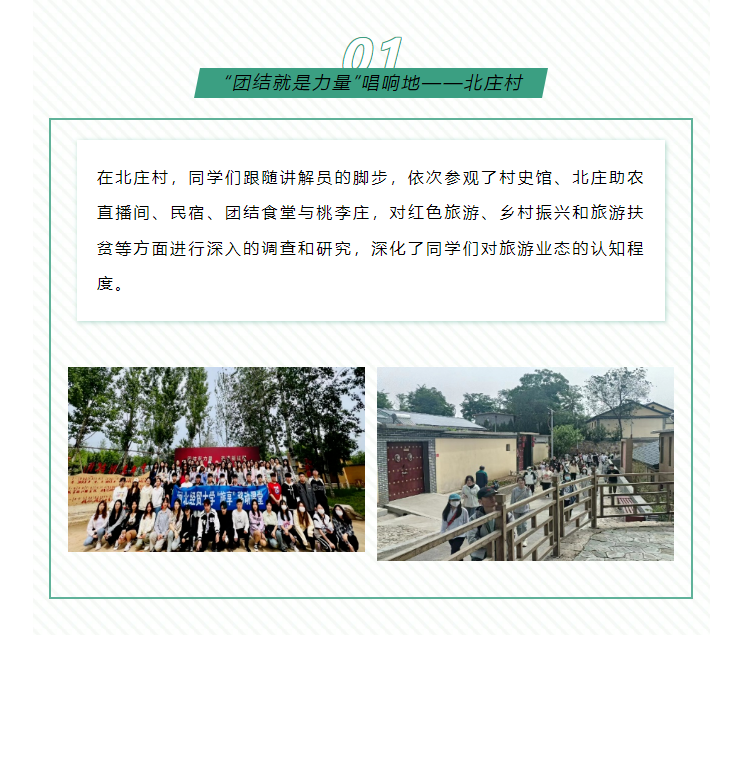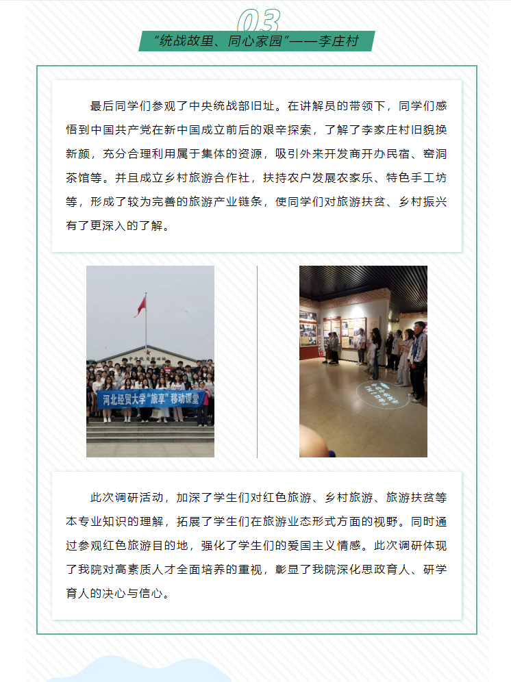 此次调研活动中,同学们在老师们的带领下先后前往了北庄村、西柏坡以及李家庄。对红色旅游、乡村旅游、研学旅游、旅游扶贫及乡村振兴方面进行深入考察,提高了学生们对旅游专业的认知与实践调研能力。