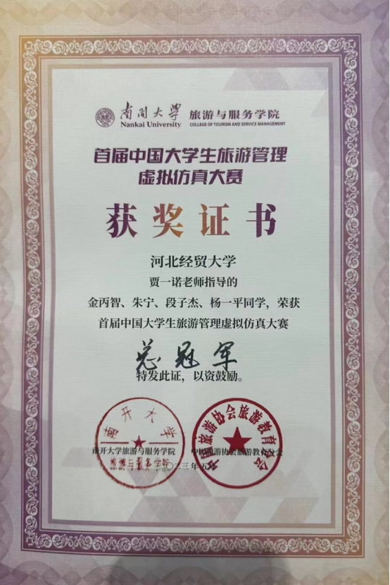 教师贾一诺带队,酒店管理专业金丙智、朱宁、段子杰、杨一平同学组队参赛,在所有队伍中总成绩排名第一,荣获此次赛事的全国总冠军!