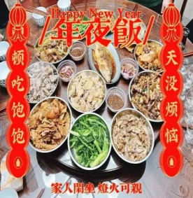 年夜饭,又称年晚饭、团年饭、团圆饭等,特指年尾除夕的阖家聚餐。团年饭是年前的重头戏,不但丰富多彩,而且很讲究意头。席上一般有鸡、鱼等,以求吉利。